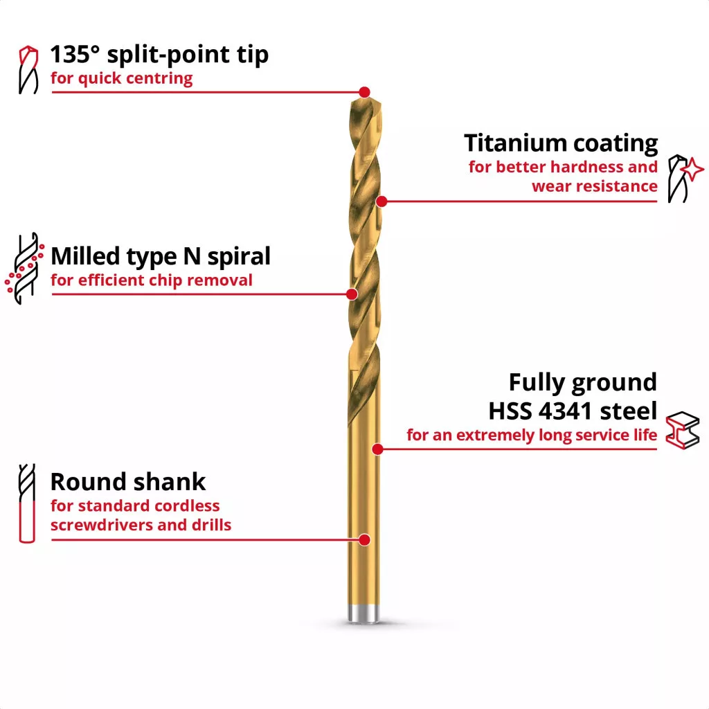 Az Einhell 13 darabos HSS-G titán fémfúrókészlete a legfontosabb 1,5 / 2 / 2,5 / 3 / 3,2 / 3,5 / 4 / 4,2 / 4,5 / 5 / 5,5 / 6 / 6,5 mm-es átmérőket tartalmazza. Ezek a HSS-G fúrók kiváló minőségű, teljesen köszörült HSS 4341 nagy teljesítményű acélból készülnek, amely rendkívül jó teljesítményéről és nagyon hosszú élettartamáról ismert. A titán-nitridálás a HSS fémfúróknak jobb keménységet és kopásállóságot, valamint aranyozott megjelenést kölcsönöz. A 135°-os hasított hegyű hegy gyors központosítást és tiszta, gyors fúrást tesz lehetővé. A DIN 338 szabványnak megfelelően a titán fúrók jobbra vágó, és mart N típusú spirállal rendelkeznek, ami hatékony forgácseltávolítást és precíz eredményeket biztosít. Az Einhell fúrófejeket vas, színesfémek, alumínium, fémprofilok, lemezek és műanyagok fúrásához használják, és ideálisak acél és különféle fémek fúrási munkáihoz. Azonban nem alkalmasak rozsdamentes acélhoz. A titánbevonatú HSS-G fúrófejek kiváló szolgáltatást nyújtanak gyakori és igényes használat esetén, különösen a barkácsolás területén. A kerek szárnak köszönhetően a fúrófej-készlet illeszkedik minden szabványos fúrótokmányhoz a kereskedelmi forgalomban kapható akkus csavarozókban és fúrókban. A készlet egy praktikus tárolódobozban található, amely rendezett helyet biztosít. Az álló funkció megkönnyíti az egyes titánfúrók kivételét. Az Euro-lyukas akasztó minden szabványos perforált fali dupla kampóhoz is alkalmas, így a kazetta felakasztható a műhelyben vagy a garázsban. Míg az átlátszó fedél gyors áttekintést nyújt a tartalomról, a robusztus automatikus záródású klipszzár biztosítja a biztonságos záródást.