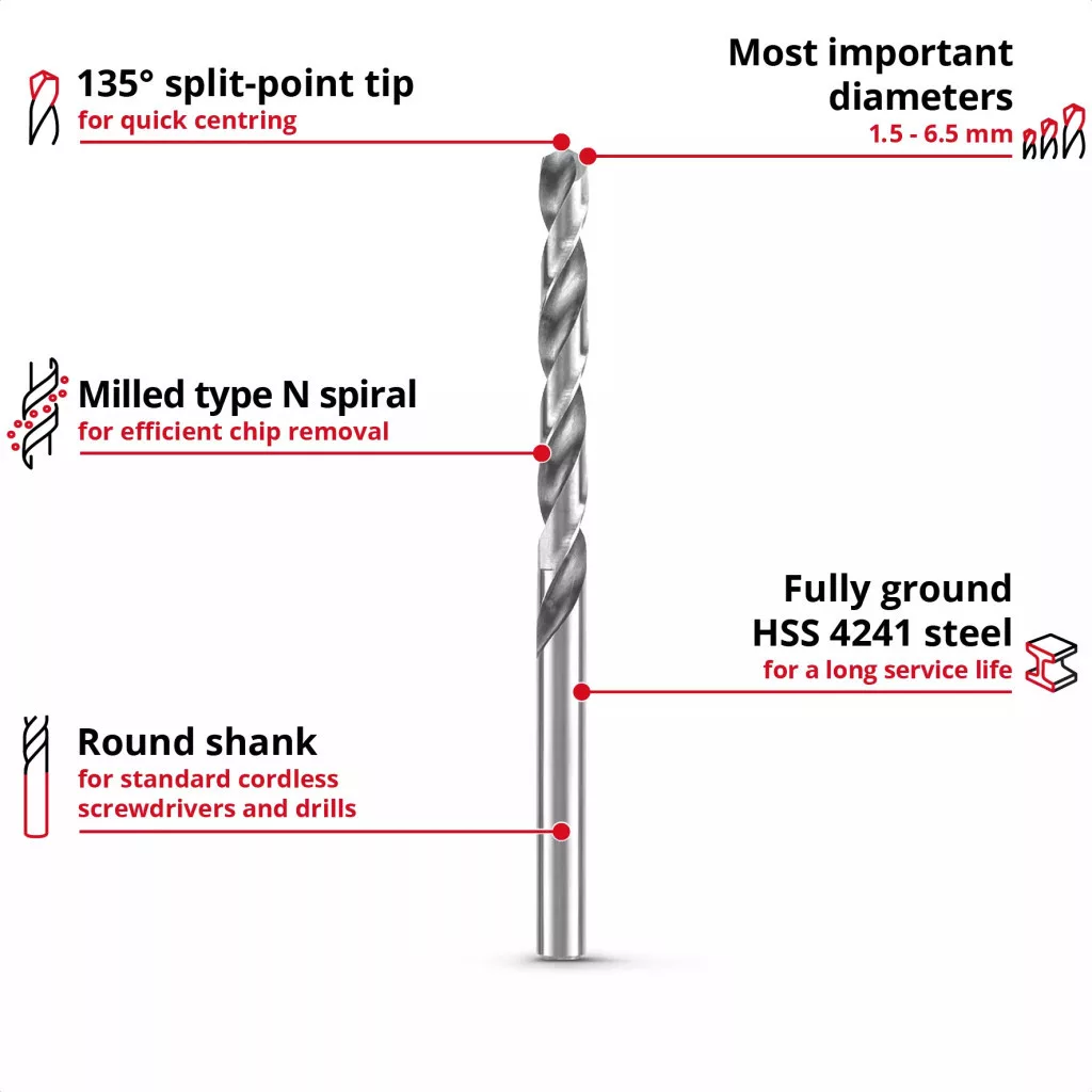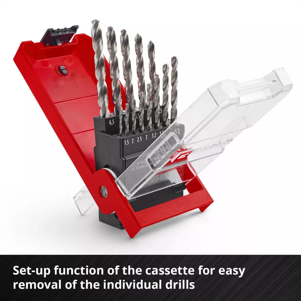 Az Einhell 13 darabos HSS-G fémfúrókészlete a legfontosabb 1,5 / 2 / 2,5 / 3 / 3,2 / 3,5 / 4 / 4,2 / 4,5 / 5 / 5,5 / 6 / 6,5 mm-es átmérőket tartalmazza. Ezek a fúrók kiváló minőségű HSS 4241 nagy teljesítményű acélból készültek, amely teljesítményéről és tartósságáról ismert. A 135°-os hasított hegyű hegy gyors központosítást és tiszta, gyors fúrást tesz lehetővé. A DIN 338 szabványnak megfelelően a fémfúrók jobbos vágásúak és mart N típusú hélixszel rendelkeznek, ami hatékony forgácseltávolítást és precíz eredményeket biztosít. A teljesen köszörült HSS-G fúrók magasfényűre polírozott felülettel rendelkeznek, amely ezüst színűvé teszi őket. Az Einhell fúrófejeket acélban, színesfémekben, alumíniumban, lemezekben és műanyagokban használják, és különösen alkalmasak vas és fémprofilok fúrási munkáihoz. Rozsdamentes acélhoz azonban nem szabad használni őket. A fúrófejek kiválóan teljesítenek gyakori használat esetén, különösen a barkácsolás területén. A kerek szárnak köszönhetően a fúrófejkészlet illeszkedik minden szabványos fúrótokmányhoz a kereskedelmi forgalomban kapható akkus csavarhúzókban és fúrókban. A készlet egy praktikus tárolódobozban található, amely rendezett helyet biztosít. Az álló funkciónak köszönhetően az egyes fúrófejek könnyen eltávolíthatók. Az Euro lyukas akasztó minden szabványos perforált fali dupla kampóhoz is alkalmas, így a kazetta felakasztható a műhelyben vagy a garázsban. Míg az átlátszó fedél gyors áttekintést nyújt a tartalomról, a robusztus automata rögzítőkapocs biztonságos zárást biztosít.