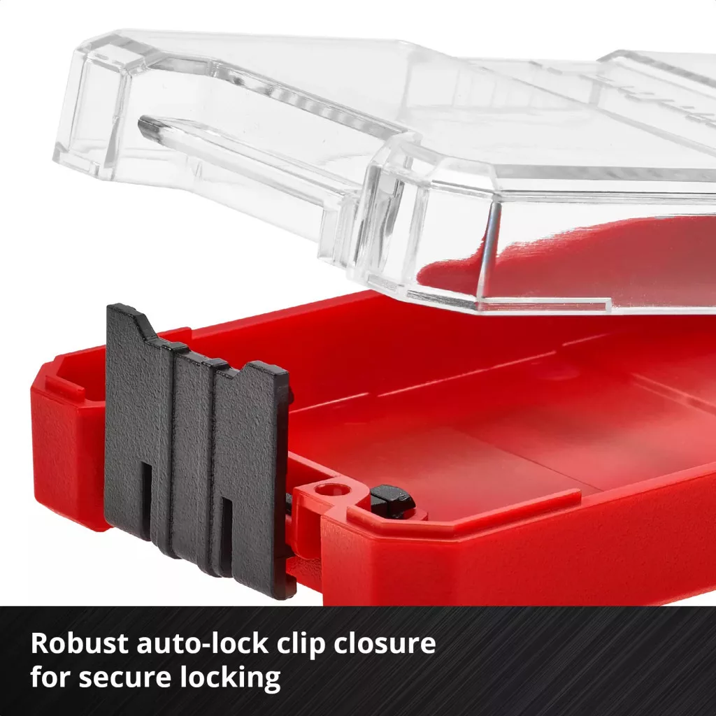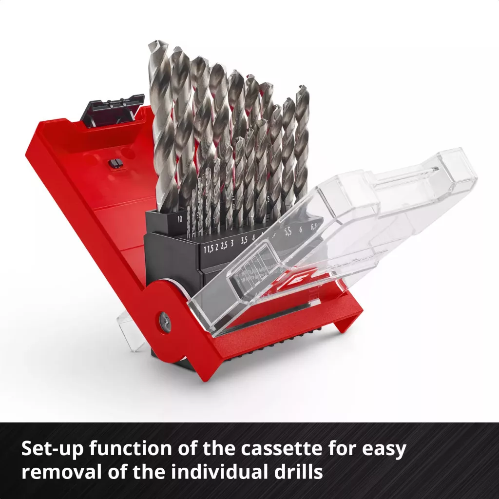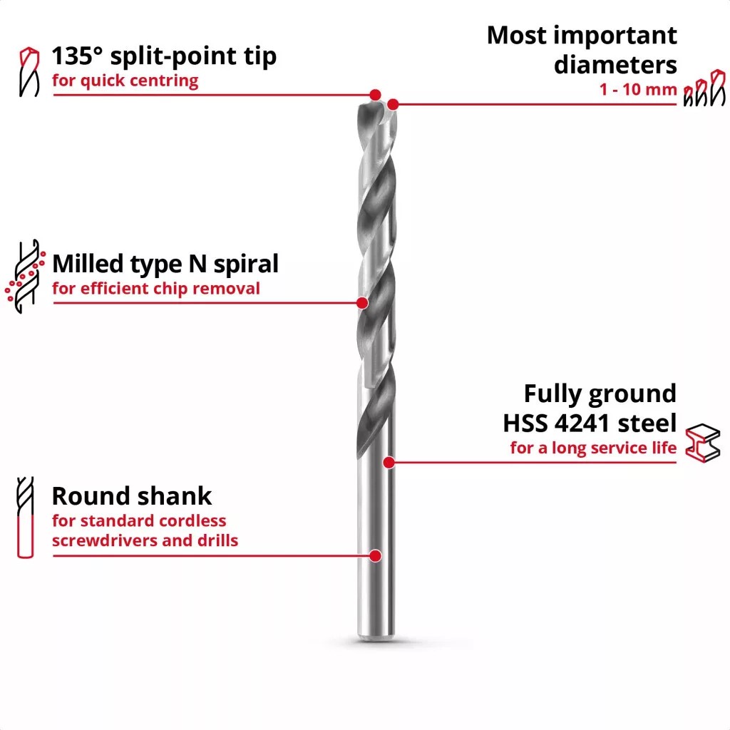 Az Einhell 19 darabos HSS-G fémfúrókészlete a legfontosabb 1 / 1,5 / 2 / 2,5 / 3 / 3,5 / 4 / 4,5 / 5 / 5,5 / 6 / 6,5 / 7 / 7,5 / 8 / 8,5 / 9 / 9,5 / 10 mm-es átmérőket tartalmazza. Ezek a fúrók kiváló minőségű HSS 4241 nagy teljesítményű acélból készültek, amely teljesítményéről és tartósságáról ismert. A 135°-os hasított hegyű hegy gyors központosítást és tiszta, gyors fúrást tesz lehetővé. A DIN 338 szabványnak megfelelően a fémfúrók jobbos vágásúak és mart N típusú húrvonallal rendelkeznek, ami hatékony forgácseltávolítást és precíz eredményeket biztosít. A teljesen köszörült HSS-G fúrók magasfényűre polírozott felülettel rendelkeznek, amely ezüst színűvé teszi őket. Az Einhell fúrófejek acélban, színesfémekben, alumíniumban, lemezekben és műanyagokban használhatók, és különösen alkalmasak vas és fémprofilok fúrására. Rozsdamentes acélhoz azonban nem szabad használni őket. A fúrófejek kiváló szolgálatot tesznek gyakori használat esetén, különösen a barkácsolásban. A kerek szárnak köszönhetően a fúrófejkészlet minden szabványos fúrótokmányhoz illeszkedik a kereskedelmi forgalomban kapható akkus csavarozókban és fúrókban. A készlet egy praktikus tárolódobozban található, amely rendezett tárolóhelyet biztosít. Az álló funkció megkönnyíti az egyes fúrófejek kivételét. Az Euro lyukas akasztó minden szabványos perforált fali dupla kampóhoz is alkalmas, így a kazetta felakasztható a műhelyben vagy a garázsban. Míg az átlátszó fedél gyors áttekintést nyújt a tartalomról, a robusztus automata rögzítőkapocs biztonságos zárást biztosít.