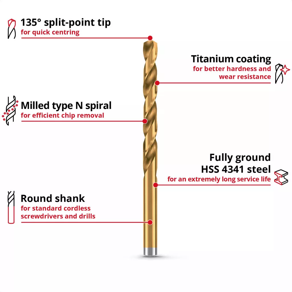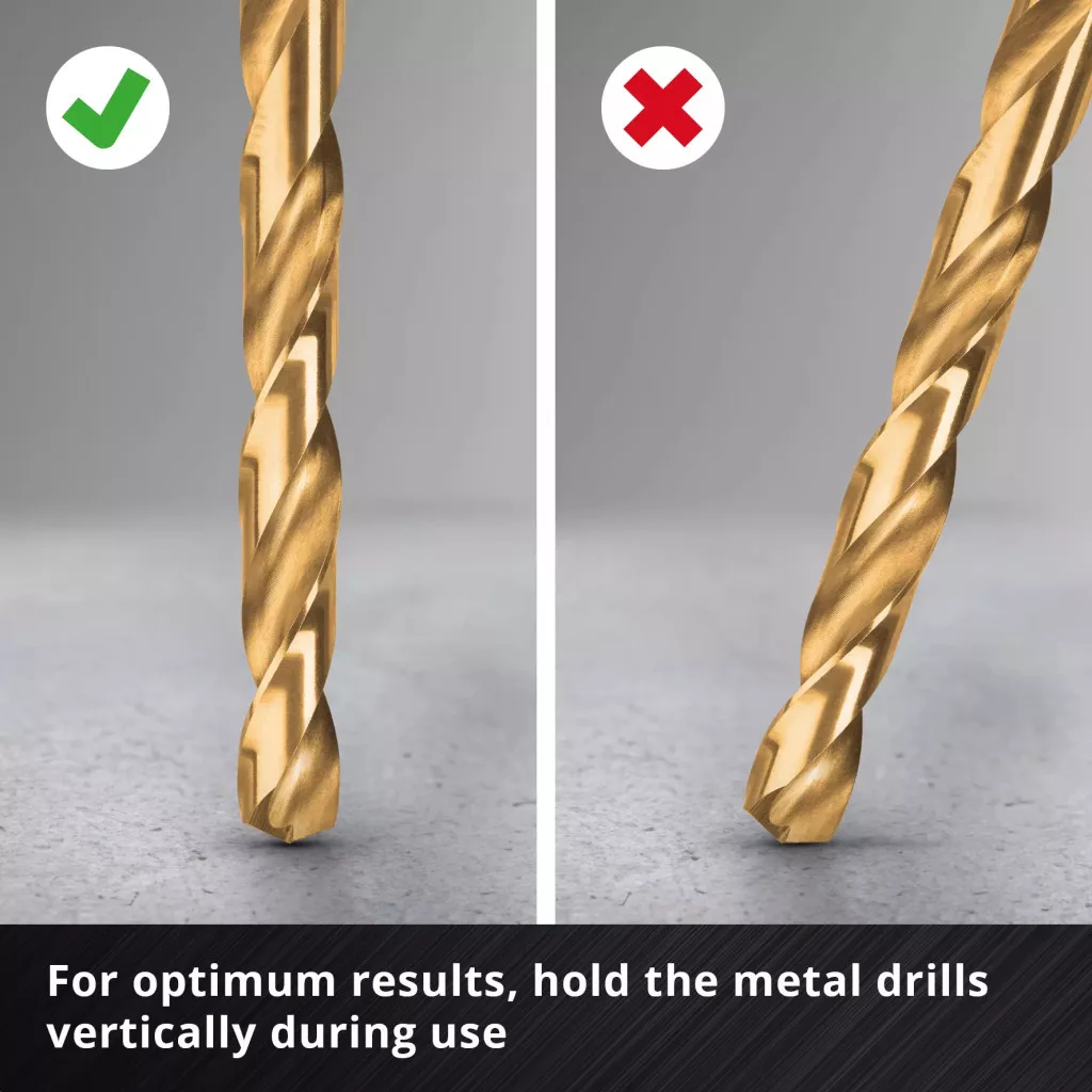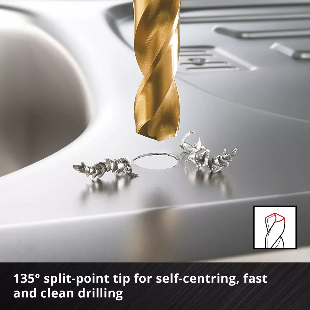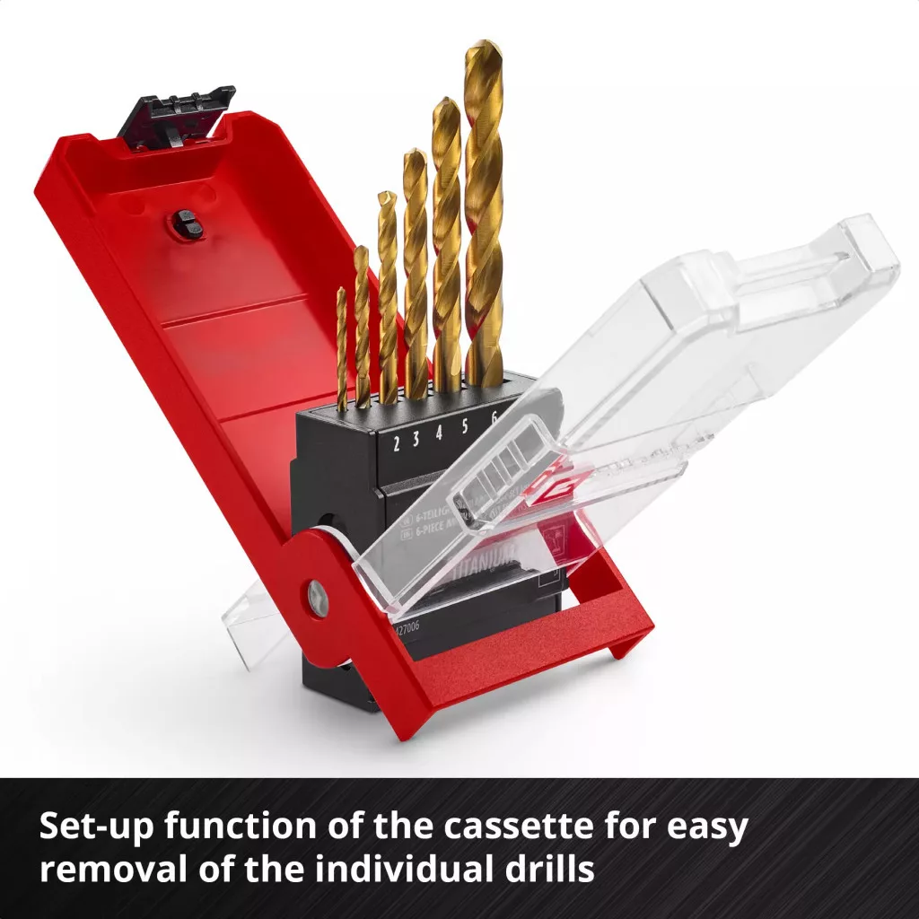 Az Einhell 6 darabos HSS-G titán fémfúrókészlete a legfontosabb 2 / 3 / 4 / 5 / 6 / 8 mm-es átmérőket tartalmazza. Ezek a HSS-G fúrók kiváló minőségű, teljesen köszörült HSS 4341 nagy teljesítményű acélból készülnek, amely rendkívül jó teljesítményéről és nagyon hosszú élettartamáról ismert. A titán-nitridálás a HSS fémfúróknak jobb keménységet és kopásállóságot, valamint aranyozott megjelenést kölcsönöz. A 135°-os hasított hegyű hegy gyors központosítást és tiszta, gyors fúrást tesz lehetővé. A DIN 338 szabványnak megfelelően a titán fúrók jobbra vágó, és mart N típusú spirállal rendelkeznek, ami hatékony forgácseltávolítást és precíz eredményeket biztosít. Az Einhell fúrófejeket vasban, színesfémekben, alumíniumban, fémprofilokban, lemezekben és műanyagokban használják, és ideálisak acél és különféle fémek fúrási munkáihoz. Rozsdamentes acélhoz azonban nem alkalmasak. A titánbevonatú HSS-G fúrók kiváló szolgáltatást nyújtanak gyakori és igényes használat esetén, különösen a barkácsolásban. A kerek szárnak köszönhetően a fúrófej-készlet minden szabványos fúrótokmányhoz illeszkedik a kereskedelmi forgalomban kapható akkus csavarhúzókban és fúrókban. A készlet egy praktikus tárolódobozban található, amely rendezett helyet biztosít. Az álló funkciónak köszönhetően az egyes titán fúrófejek könnyen eltávolíthatók. Az Euro lyukas akasztó minden szabványos perforált fali dupla kampóhoz is alkalmas, így a kazetta felakasztható a műhelyben vagy a garázsban. Míg az átlátszó fedél gyors áttekintést nyújt a tartalomról, a robusztus automata rögzítőkapocs biztonságos zárást biztosít.