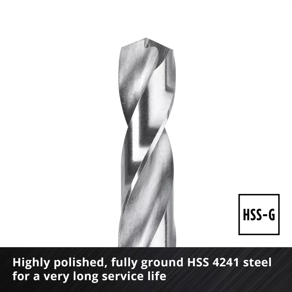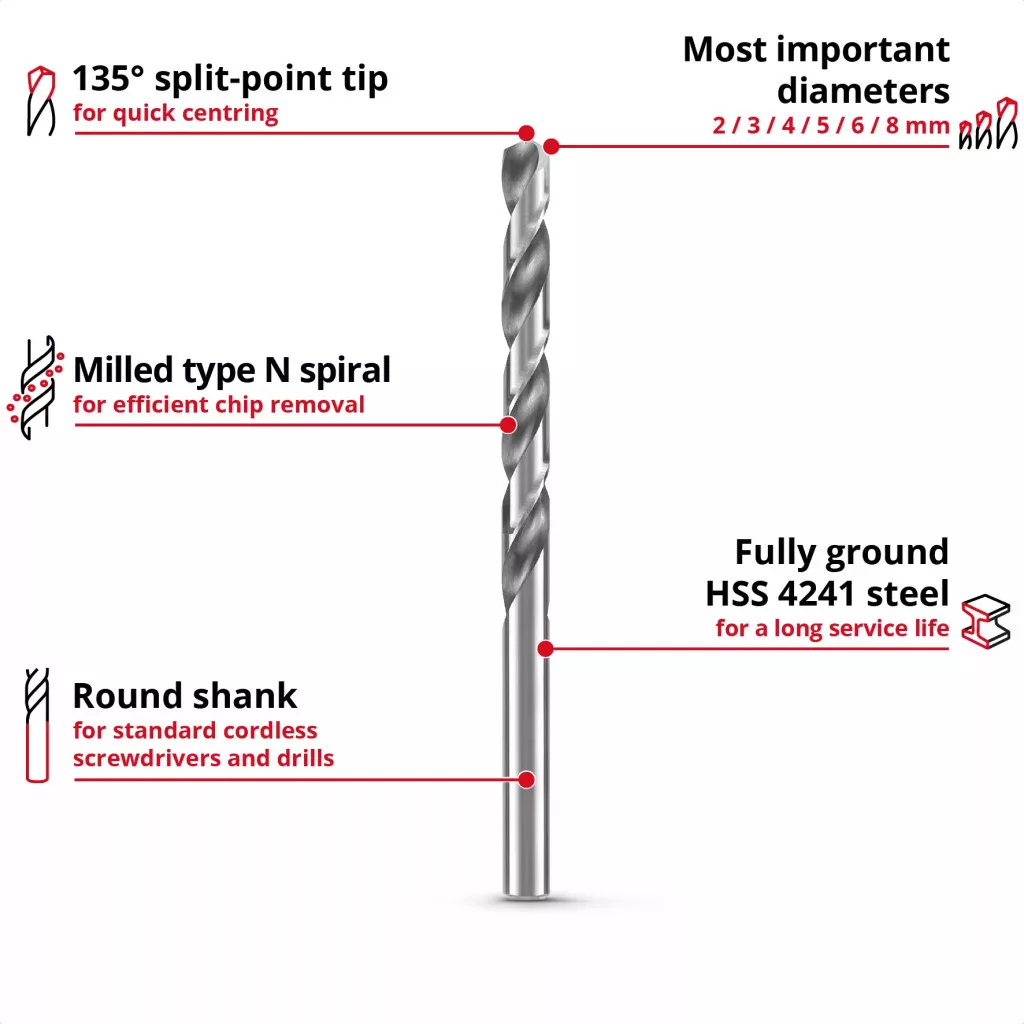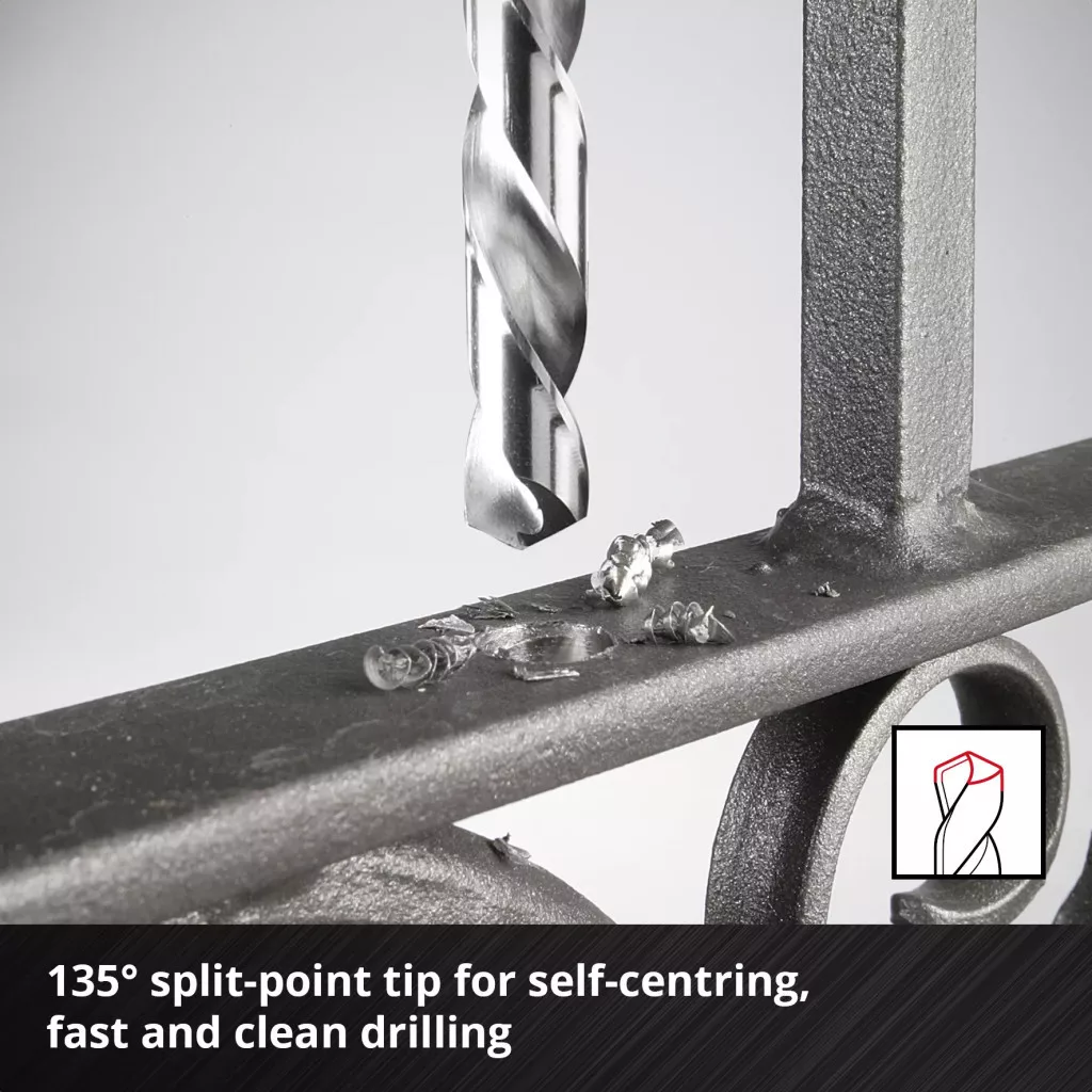 Az Einhell 6 darabos HSS-G fémfúrókészlete a legfontosabb 2 / 3 / 4 / 5 / 6 / 8 mm-es átmérőket tartalmazza. Ezek a fúrók kiváló minőségű HSS 4241 nagy teljesítményű acélból készülnek, amely teljesítményéről és tartósságáról ismert. A 135°-os hasított hegy gyors központosítást és tiszta, gyors fúrást tesz lehetővé. A DIN 338 szabványnak megfelelően a fémfúrók jobbos vágásúak és mart N típusú hélixszel rendelkeznek, ami hatékony forgácseltávolítást és precíz eredményeket biztosít. A teljesen köszörült HSS-G fúrók magasfényűre polírozott felülettel rendelkeznek, amely ezüst színűvé teszi őket. Az Einhell fúrófejeket acélban, színesfémekben, alumíniumban, lemezekben és műanyagokban használják, és különösen alkalmasak vas és fémprofilok fúrási munkáihoz. Rozsdamentes acélhoz azonban nem szabad használni őket. A fúrófejek kiváló szolgálatot tesznek gyakori használat esetén, különösen a barkácsolásban. A kerek szárnak köszönhetően a fúrófejkészlet illeszkedik minden szabványos fúrótokmányhoz a kereskedelmi forgalomban kapható akkus csavarhúzókban és fúrókban. Egy praktikus tárolódobozban tárolhatók, amely rendezett tárolóhelyet biztosít. Az álló funkció megkönnyíti az egyes fúrófejek kivételét. Az Euro lyukas akasztó minden szabványos perforált fali dupla kampóhoz alkalmas, így a kazetta felakasztható a műhelyben vagy a garázsban. Míg az átlátszó fedél gyors áttekintést nyújt a tartalomról, a robusztus automatikus záródású klipsz biztonságos zárást biztosít.