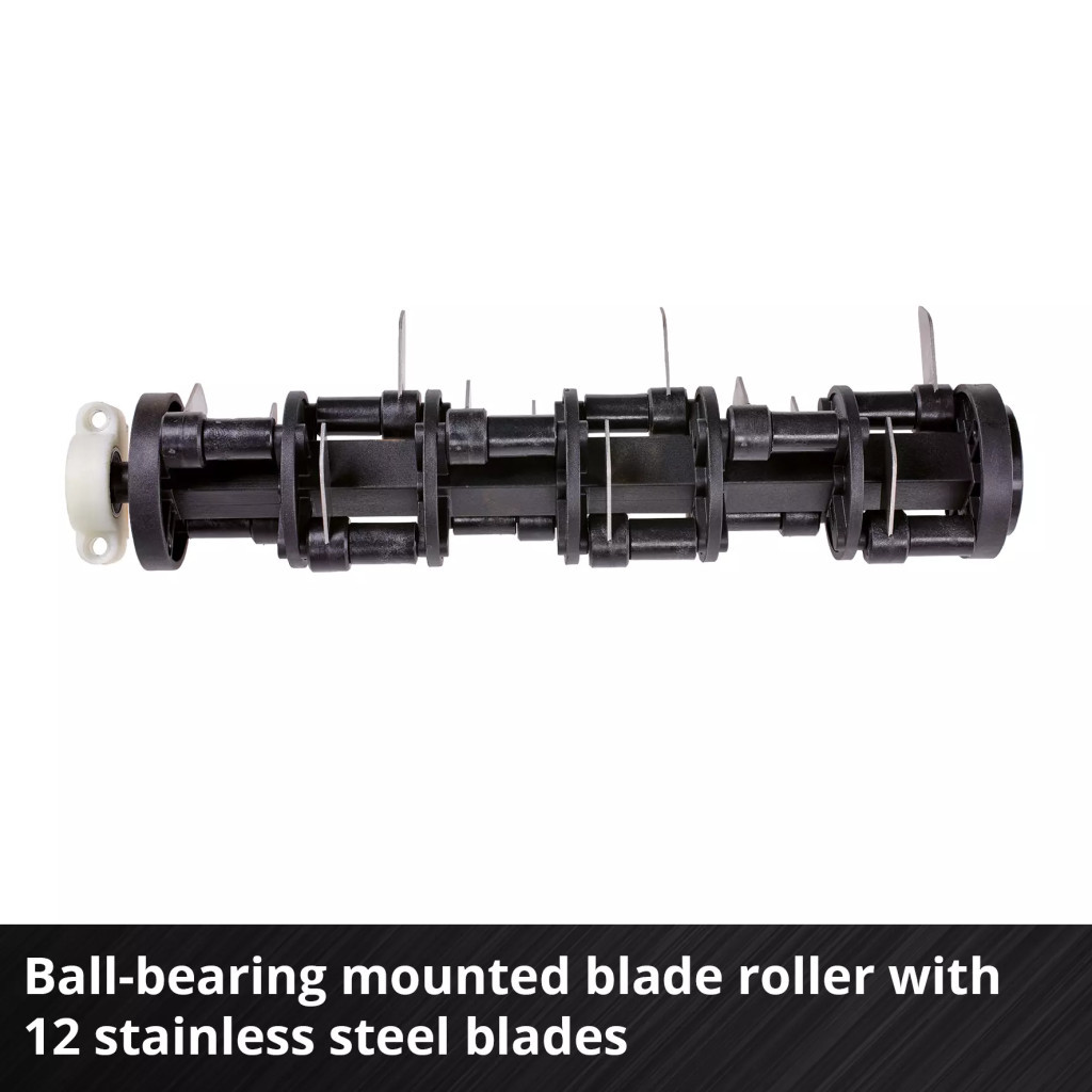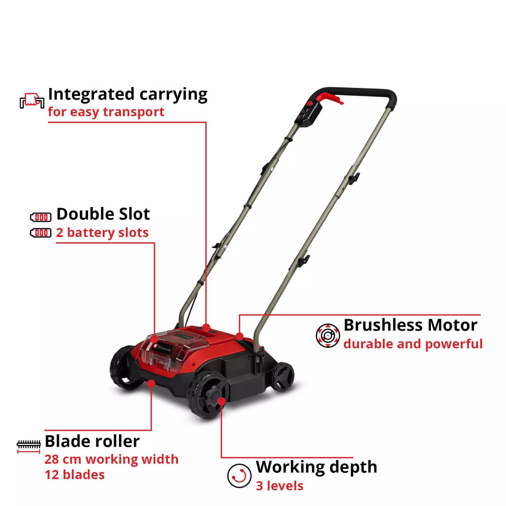 Az Einhell akkus talajlazító/gyepszellőztető GC-SC 18/28 DS Li-Solo optimális otthoni gyepápolást biztosít. A Power X-Change termékcsalád tagjaként ez a gép vezeték nélküli szabadságot kínál, és lehetővé teszi a kert minden szegletének gondozását. A dupla foglalatú technológiának és a két integrált akkumulátorhellyel a talajlazító két akkumulátorral is felszerelhető a hosszabb üzemidő érdekében. Ha az egyik akkumulátor lemerült, a tápellátás automatikusan a második, feltöltött akkumulátorra vált. A gépet egy Einhell kefe nélküli motor hajtja. Ez a kefe nélküli motor nagyobb teljesítményt és hosszabb üzemidőt biztosít, mint egy hagyományos szénkefés motor. Online regisztráció után 10 év garancia jár a kefe nélküli motorra. Helytakarékos tárolás a talajlazító/gyepszellőztető összecsukható vezetősínének köszönhetően. A készülék könnyen szállítható a beépített hordozófogantyú segítségével. A csomag tartalmaz egy 28 cm széles, 12 pengés pengéjű hengert. Ezenkívül az akkus talajlazító kompatibilis egy külön megvásárolható 28 cm széles talajlazító hengerrel, így egy praktikus 2 az 1-ben kombinált eszközzé alakítható. A működéshez 18 V-os akkumulátor szükséges. Az Einhell GC-SC 18/28 DS Li-Solo akkus talajlazító/gyepszellőztető akkumulátor és töltő nélkül kerül szállításra. Ezek külön vásárolhatók meg.