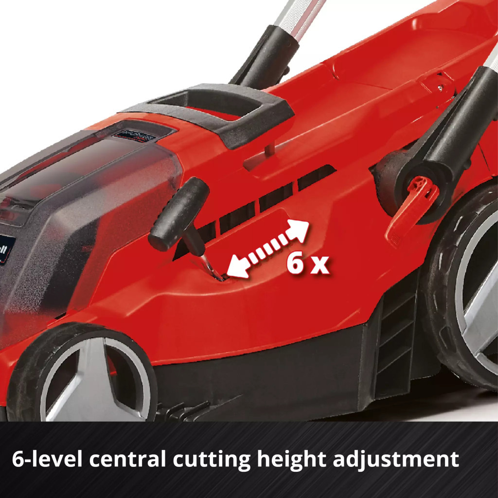 Az Einhell GP-CM 36/450 akkus fűnyíró erőteljes, kábelmentes vágást biztosít – még a kert szűk szegleteiben is. Akár 450 m²-es gyepfelületekhez ajánlott, két 4,0 Ah-s Power X-Change akkumulátorral működik. A Power X-Change akkumulátorok a rendszercsalád összes Einhell szerszámával használhatók. A három LED-es töltöttségi szintjelző folyamatosan mutatja a rendelkezésre álló energiatartalékokat. A Power X-Twincharger rendszer gyorstöltőjével az akkumulátorok gyorsan feltölthetők. A fűnyírót az Einhell szénkefe nélküli motorja hajtja, amely nagyobb teljesítményt és hosszabb üzemidőt biztosít, mint a hagyományos szénkefés motorok. Online regisztrációt követően 10 év garancia vonatkozik a szénkefe nélküli motorra. A 6 fokozatú központi vágási magasságállítás 25 és 75 mm között, a 38 cm-es vágási szélességgel kombinálva lehetővé teszi az egyedi gyepkialakítást. A gyepfésű lehetővé teszi a szegélyekhez közeli nyírást. A Highwheeler kialakítás nagy felületű kerekekkel rendelkezik, míg az ergonomikus kialakítású fogantyú kényelmes kezelést biztosít. A teleszkópos, magasságban állítható tolókar a felhasználóhoz igazodik, és lehajtható a kényelmes tárolás érdekében. Az integrált hordozófogantyú megkönnyíti a szállítást. Az alumíniumból készült tolókar könnyű, mégis robusztus. A 45 literes fűgyűjtő zsák praktikus töltöttségi szintjelzővel rendelkezik. A csomag egy mulcsdugót is tartalmaz.