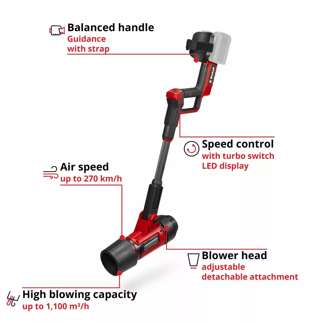 Az Einhell Professional GP-LB 36/270 Li E BL akkus lombfúvó a nagy teljesítményt és az ergonomikus kialakítást ötvözi a hatékony levelek eltávolításához. A nagy teljesítményű, 36 V-os akkus lombfúvó az erőteljes Einhell Power X-Change termékcsalád tagja, ahol minden akkumulátor, rendszereszköz és töltő rugalmasan kombinálható. A 270 km/h maximális légsebességnek és az 1100 m³/h fúvóteljesítménynek köszönhetően a fúvó könnyedén megbirkózik a nedves lombozattal, a szennyeződéssel, sőt még a kisebb gyümölcsökkel és diófélékkel is. A szerszámot egy Einhell kefe nélküli motor hajtja. Ez a kefe nélküli motor nagyobb teljesítményt és hosszabb üzemidőt biztosít, mint egy hagyományos szénkefés motor. Az online regisztrációt követően 10 év garancia jár a kefe nélküli motorra. Az erőteljes axiális ventilátor egyenletes és hatékony légáramlást biztosít. A kettős üzemmód maximális légáramlást biztosít a fúvótoldalék segítségével, ami tökéletes nagyobb felületekhez és nedves lombozathoz, vagy maximális sebességet tartozék nélkül, ami ideális a cserjék és bokrok alatti precíz munkához. A fúvófej 4 fokozatban állítható, akár 90°-ig, így könnyebb a nehezen elérhető helyeken végzett munka. A lombozat vagy a szennyeződés könnyen eltávolítható a talajról. A turbókapcsoló a fokozatmentes sebességszabályozással kombinálva maximum 1100 m³/h fúvóteljesítményt biztosít. A praktikus LED-ek jelzik az aktuálisan beállított sebességet. A kiegyensúlyozott, puha markolatú és kartámasszal ellátott fogantyú kényelmes kezelést biztosít, míg az alkarpánt további támaszt nyújt és segíti a szerszám irányítását. Ezáltal a hosszabb használat is kényelmes és fáradtságmentes. Az akkus lombfúvó akkumulátor és töltő nélkül kerül szállításra. Ezek külön megvásárolhatók, például egy praktikus kezdőkészletben.