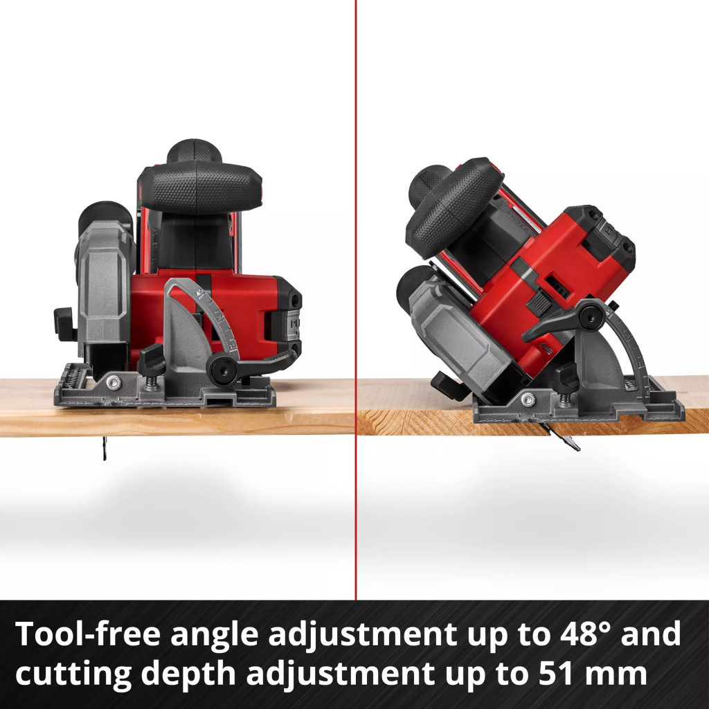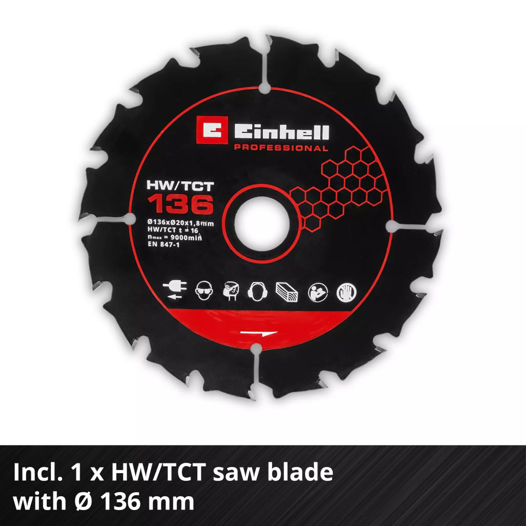 Az Einhell Professional TP-CS 18/136-C Li BL - Solo akkus körfűrész nélkülözhetetlen eszköz a szakemberek és a barkácsolók számára. Könnyű, mégis erőteljes, az akkus körfűrész kompaktabb kialakítású a hasonlóan erős körfűrészekhez képest, így rugalmasan és egyszerűen használható a műhelyben vagy a garázsban. A szerszámot egy Einhell kefe nélküli motor hajtja. Ez a kefe nélküli motor nagyobb teljesítményt és hosszabb üzemidőt biztosít, mint egy hagyományos szénkefés motor. Online regisztráció után 10 év garancia jár a kefe nélküli motorra. A maximum 51 mm-es vágási mélységgel (90°-nál) a kiváló minőségű, 136 mm átmérőjű és 16 fogú HW/TCT fűrészlap könnyedén vágja át a fát. A fűrészlap tartozék, és az orsóretesz segítségével könnyen felszerelhető vagy cserélhető. A vágási szög (akár 48°) és a vágási mélység is szerszám nélkül állítható. Az olyan vágási segédeszközök, mint a jól látható vágási vonaljelző, a párhuzamos vezető, a kiváló minőségű alumínium fűrészasztal és a fényes LED-lámpa precíz vágásokat és a munkadarab jó rálátását biztosítják. A forgó szívóadapter a hatékony forgácseltávolítással együtt segít tisztán tartani a munkahelyet. Az optimális felhasználó- és eszközbiztonság érdekében a professzionális TP-CS 18/136-C Li BL akkus körfűrész elektromos motorfékkel, lágyindítási funkcióval és puha markolatú felületekkel van felszerelve. A kompakt kézi körfűrész kompatibilis az Einhell vezetősín-rendszerével. A kézi körfűrész akkumulátor és töltő nélkül kerül szállításra. Ezek külön kaphatók, például praktikus kezdőkészletként.