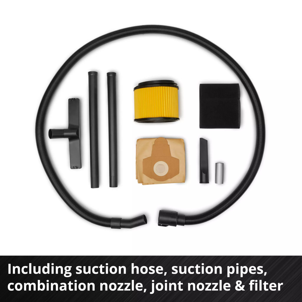 Az erős Einhell TC-VC 3055 SA nedves/száraz porszívó tökéletesen alkalmas a ház, a műhely és a garázs körüli alapos takarításra. 900 W teljesítményével és 190 mbar szívókapacitásával megbízhatóan eltávolítja a port, a szennyeződéseket és a folyadékokat a legkülönfélébb felületekről. A porszívó robusztus, 30 literes rozsdamentes acél tartállyal van felszerelve. A beépített vízleeresztő csavar megkönnyíti a felszívott folyadékok kiürítését. A Ø 36 mm-es tömlőrendszer nagy levegő- és szennyeződés-áteresztő képességet biztosít. A fúvócsatlakozás a nehezen elérhető helyek, például sarkok és repedések kifújására szolgál. A nagy kerekek és görgők, valamint a hordozófogantyú könnyű szállítást és rugalmas kezelést biztosít. Ezenkívül a házba egy automatikus készülékcsatlakozó is be van építve, ahová elektromos szerszámok csatlakoztathatók. Ha egy csatlakoztatott szerszám be van kapcsolva vagy kikapcsolva, a nedves/száraz porszívó is automatikusan vagy kis késleltetéssel be- vagy kikapcsol. A házon található praktikus tartozék- és kábeltárolók biztosítják a praktikus használatot. Egy 2,50 m-es szívótömlő, egy kétrészes hosszabbító cső, egy kombinált szívófej szőnyegekhez és kemény padlókhoz, valamint egy réstisztító fej tartozik hozzá. Ezenkívül a mellékelt habszűrővel, redőzött szűrőkkel és papír porzsákkal azonnal elkezdheti a nedves és száraz porszívózást.