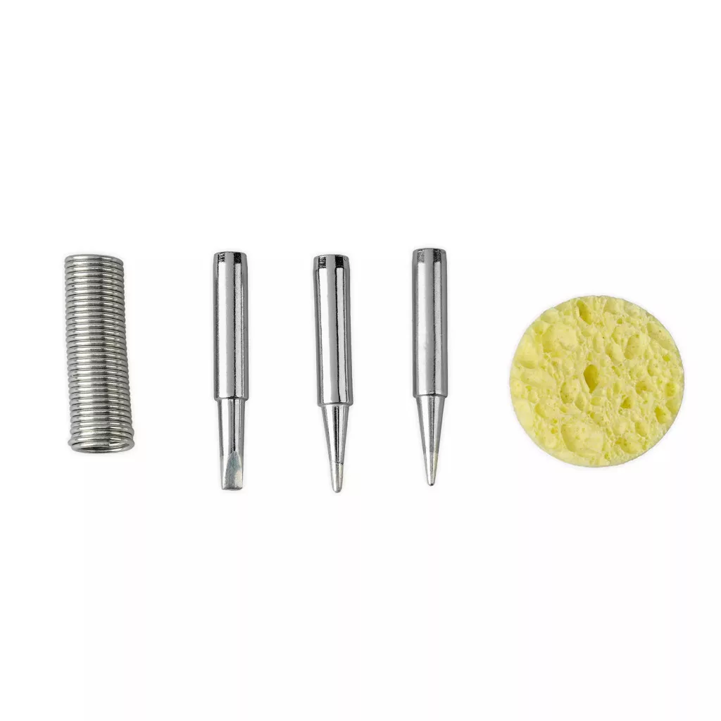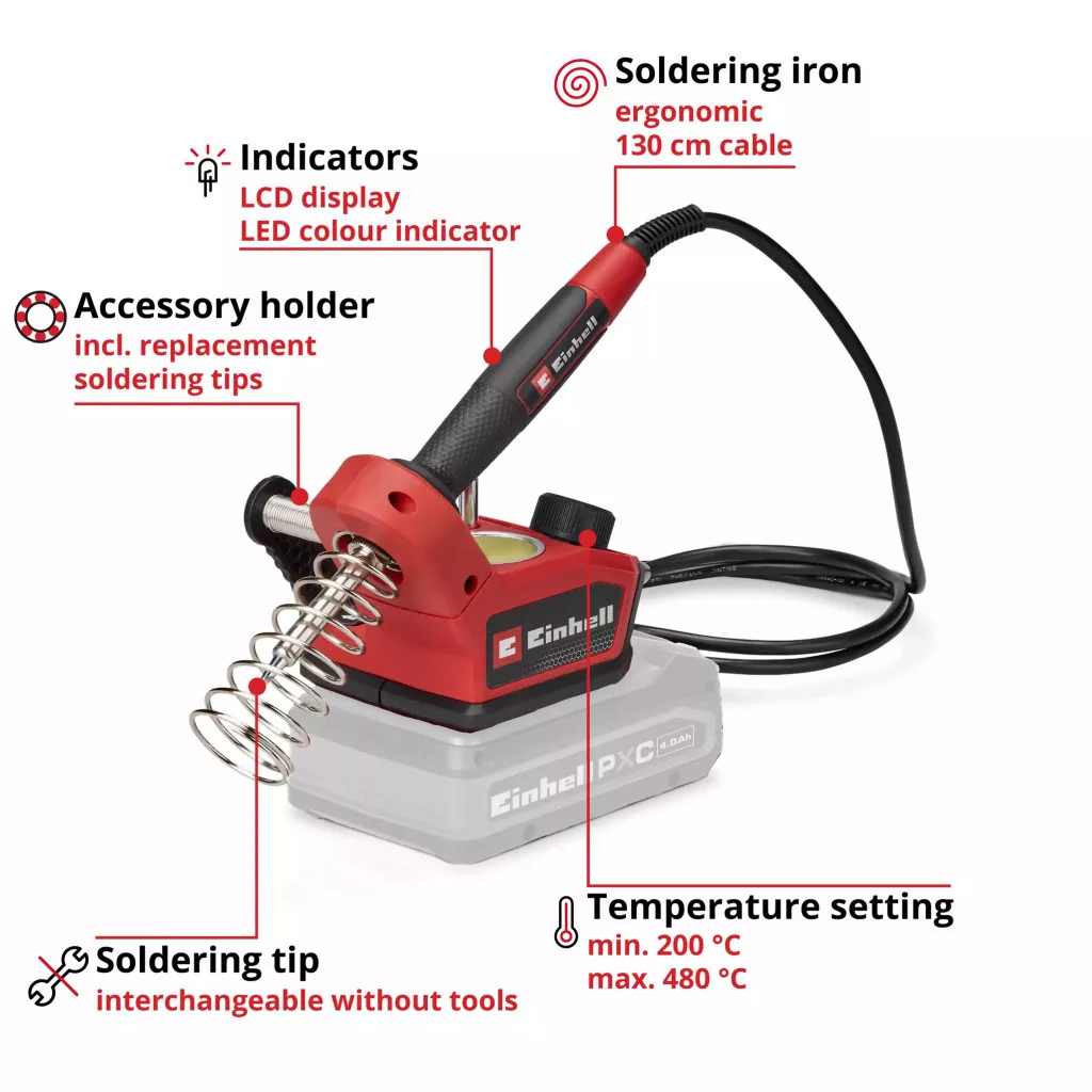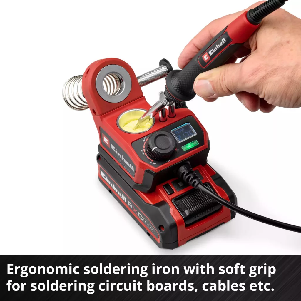 Az Einhell TE-SI 18/480 Li E - Solo akkus forrasztópáka maximális mobilitást kínál a precíz lágyforrasztáshoz. A Power X-Change család tagjaként az akkus forrasztóállomás rugalmas munkavégzést tesz lehetővé konnektor nélkül. 200°C és 480°C közötti hőmérsékletével ideális áramköri kártyák, kábelek és vezetékek forrasztásához. A kívánt hőmérséklet egy nagyméretű állítókerékkel állítható be. Egy fényes LED jelzi a fűtési állapotot, míg az LCD kijelző a forrasztóhegy pontos hőmérsékletét mutatja. Az ergonomikus forrasztópáka puha markolatú felülete biztonságos fogást biztosít munka közben. A beépített érintésvédelemmel ellátott tartó biztonságot nyújt a páka hűlési ideje alatt. A forrasztóhegy lehűlés után szerszám nélkül cserélhető. A forrasztópáka készlet 2 db hegyes, 1 db lapos heggyel, forrasztópálcikával (Ø 1,0 mm) és egy tisztítószivaccsal érkezik. Ezenkívül egy praktikus tartó is beépített a további forrasztóhegyek számára. A készüléket akkumulátor és töltő nélkül szállítjuk. Ezek külön megvásárolhatók.
