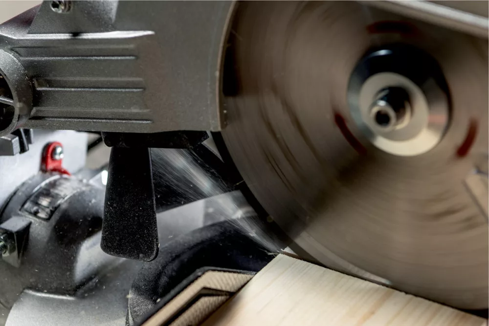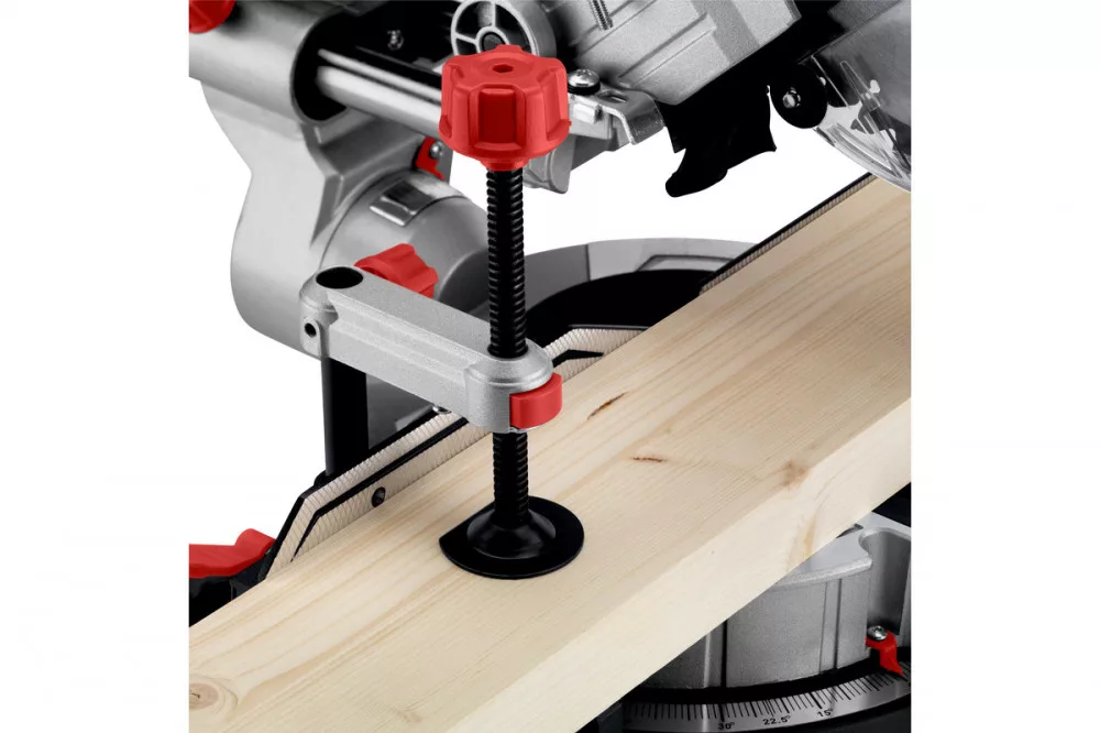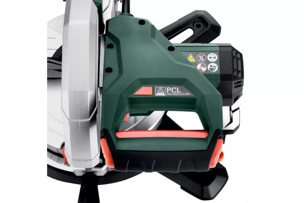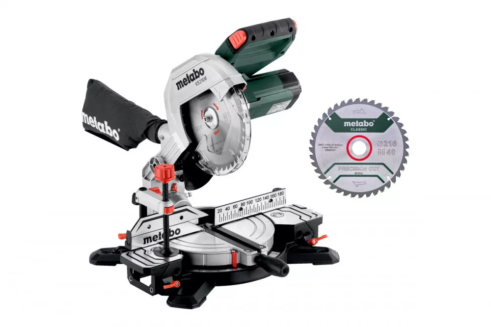 Főrészlap "Precision cut wood - classic" 216x30 Z40, második keményfém főrészlap, 2 db beépített asztalszélesítő, Daraboló ütköző, Anyagleszorító, Szerszám a főrészlapcseréhez, Forgácsgyőjtő zsák